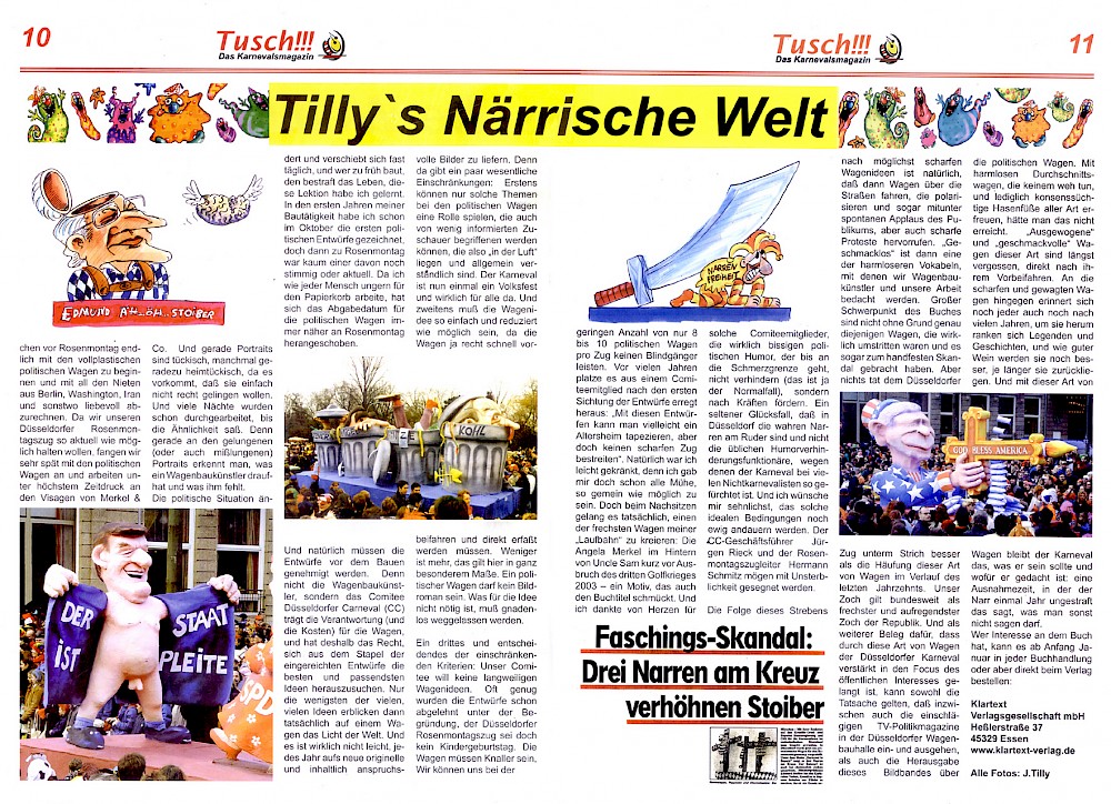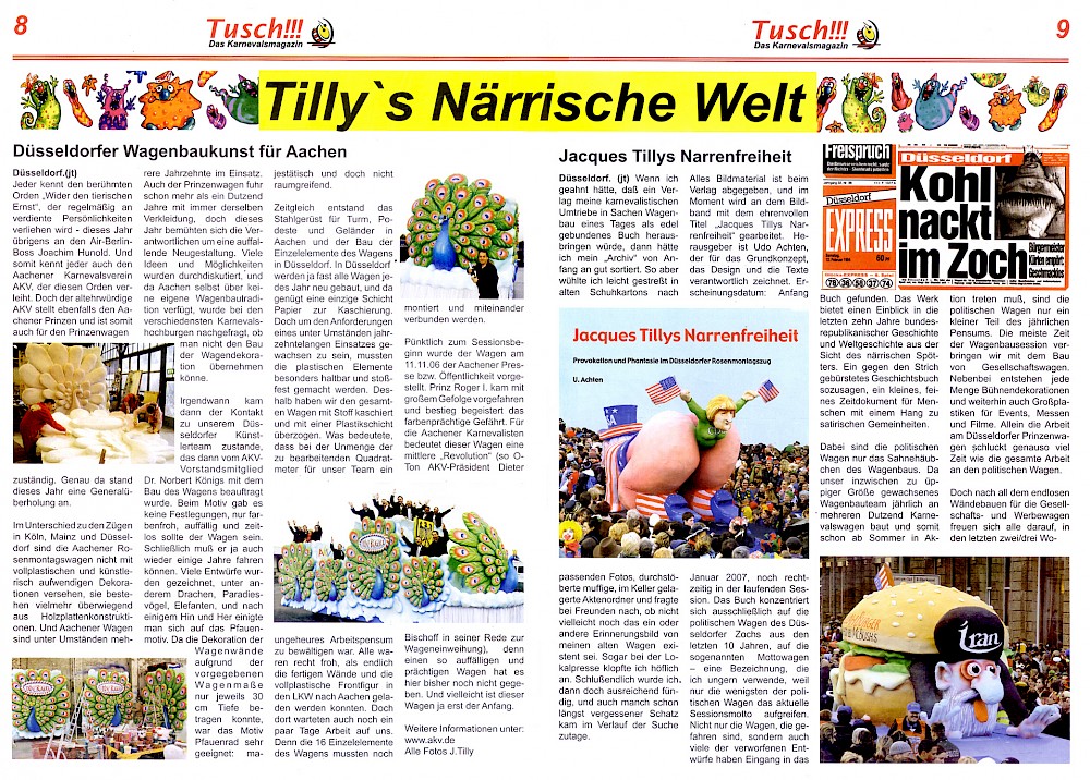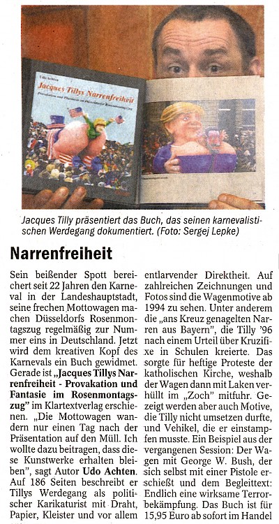 Witzig, frech und provokant - die politischen Karnevalswagen von Jacques Tilly gehören zum Besten, was der deutsche Karneval zu bieten hat. Mit seinem gepfefferten Humor und einer Fülle von überraschenden Bildideen ist es ihm gelungen, aus dem Düsseldorfer Rosenmontagszug ein bundesweit beachtetes Ereignis zu machen. In dem aktuellen Bildband "Tillys Narrenfreiheit" hat Autor Udo Achten die besten Wagen des umstrittenen Bildhauers von Beginn der 90er Jahre bis heute zu einem großartigen Panorama zusammengestellt. Das Buch spiegelt die große und kleine Politik aus der Perspektive des respektlosen Karikaturisten und lotet die Grenzen der Meinungs- und Narrenfreiheit aus - ein unverzichtbarer Beitrag zur Zeitgeschichte.