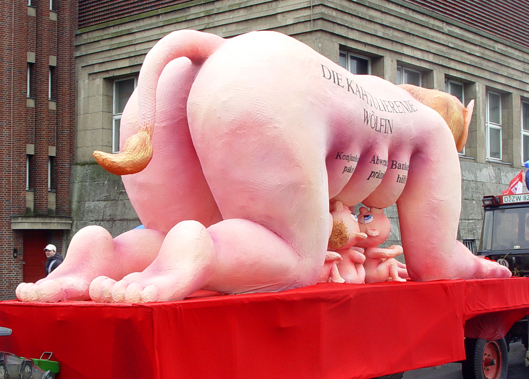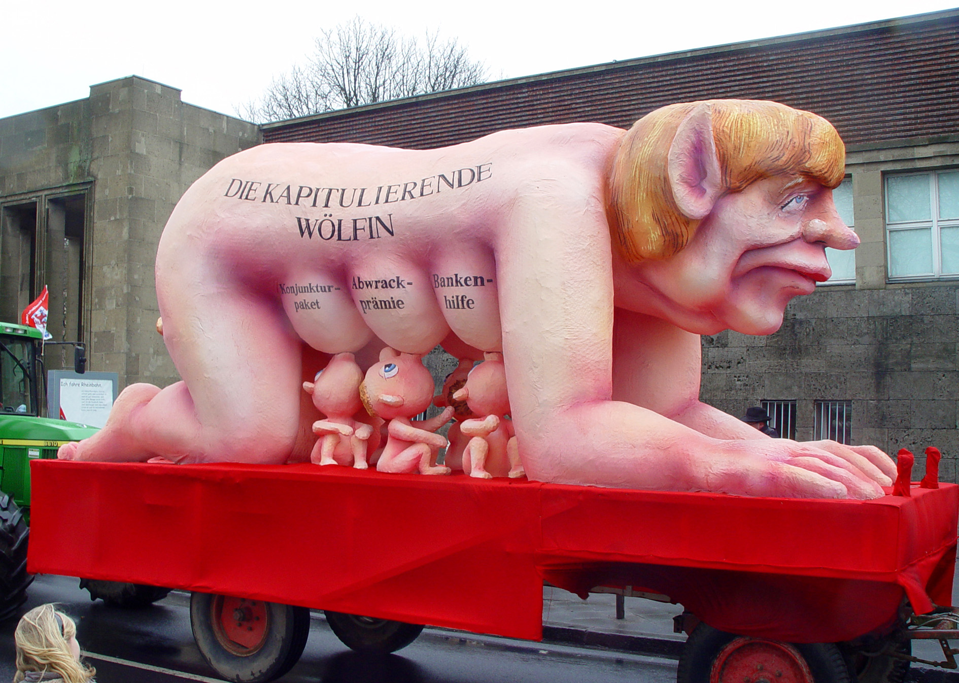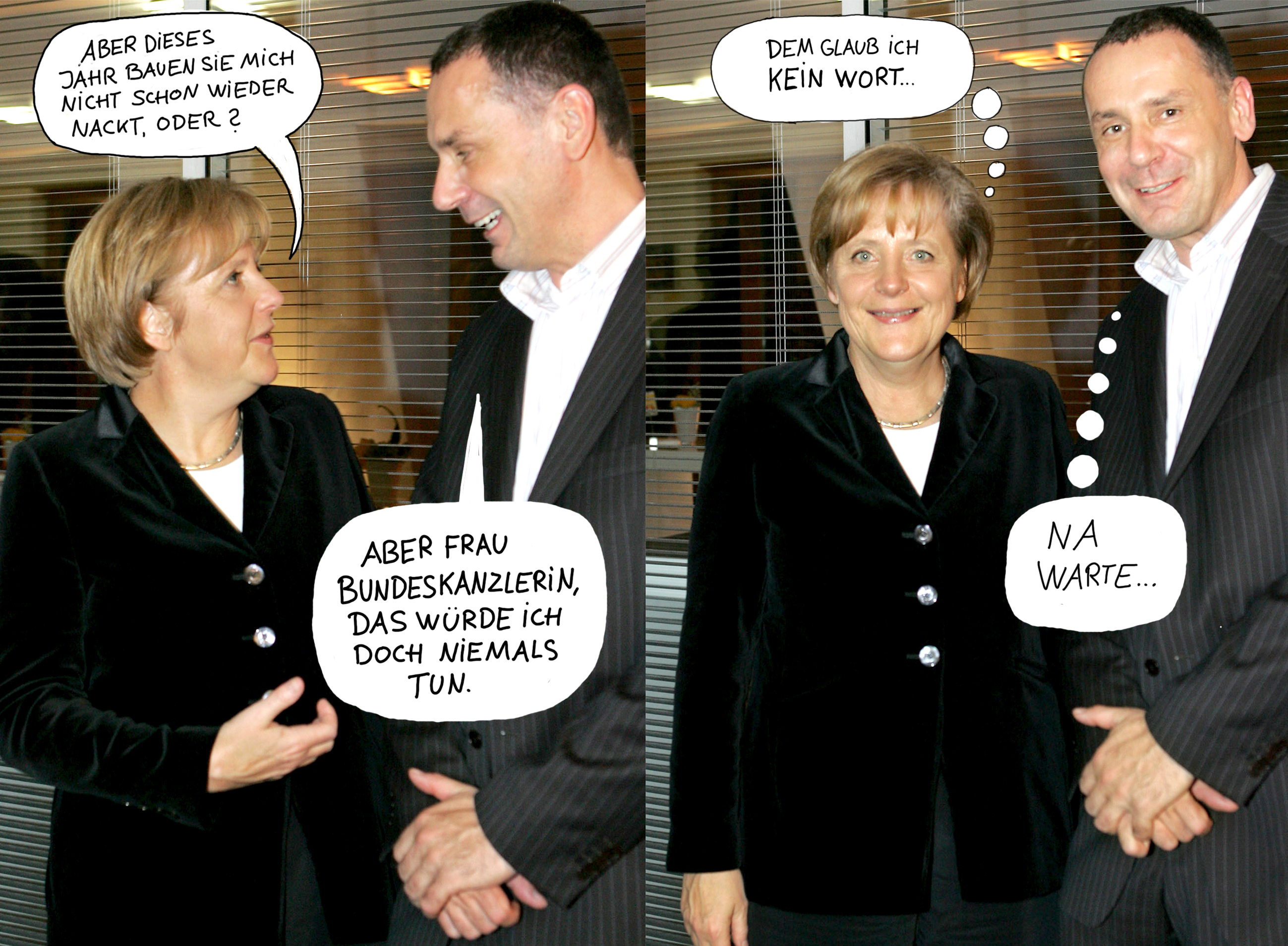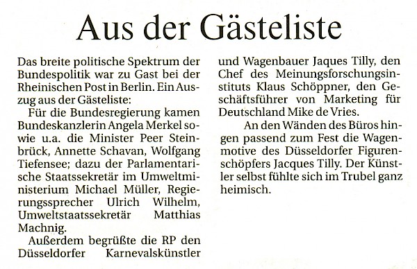 Der Künstler und sein Aktmodell. Im Rahmen des Pressefestes der Rheinischen Post im November 2008 in Berlin konnte Wagenbaukünstler Jacques Tilly sein nächstes Karnevalsopfer persönlich in Augenschein nehmen. Während der Veranstaltung fand eine Ausstellung von Jacques Tillys politischen Karnevalswagen statt.