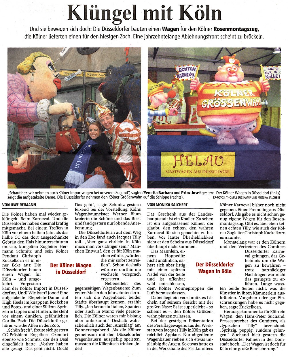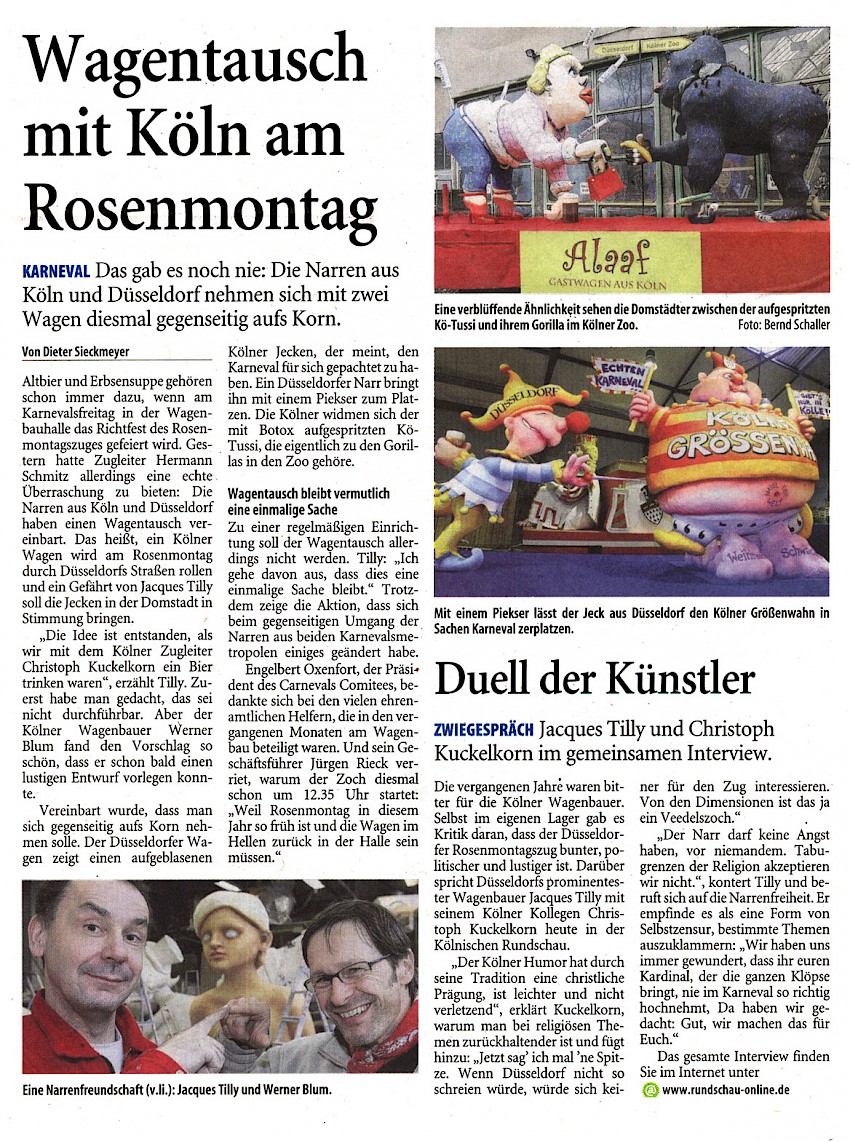 Der Kölner Wagenbauer Werner Blum baute einen Anti-Düsseldorfwagen für den Düsseldorfer Zug 2008, der Düsseldorfer Wagenbauer Jacques Tilly baute den Anti-Kölnwagen für den Kölner Zug 2008. Beide Wagen fuhren zeitgleich in den jeweiligen Zügen mit.