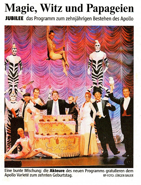 Torte für eine Bühnenshow des Roncalli/Apollo-Varietés in Düsseldorf anlässlich des 10jährigen Bestehens. In der Torte ist ein Schauspieler versteckt, der während der Show aus der Torte springt.
