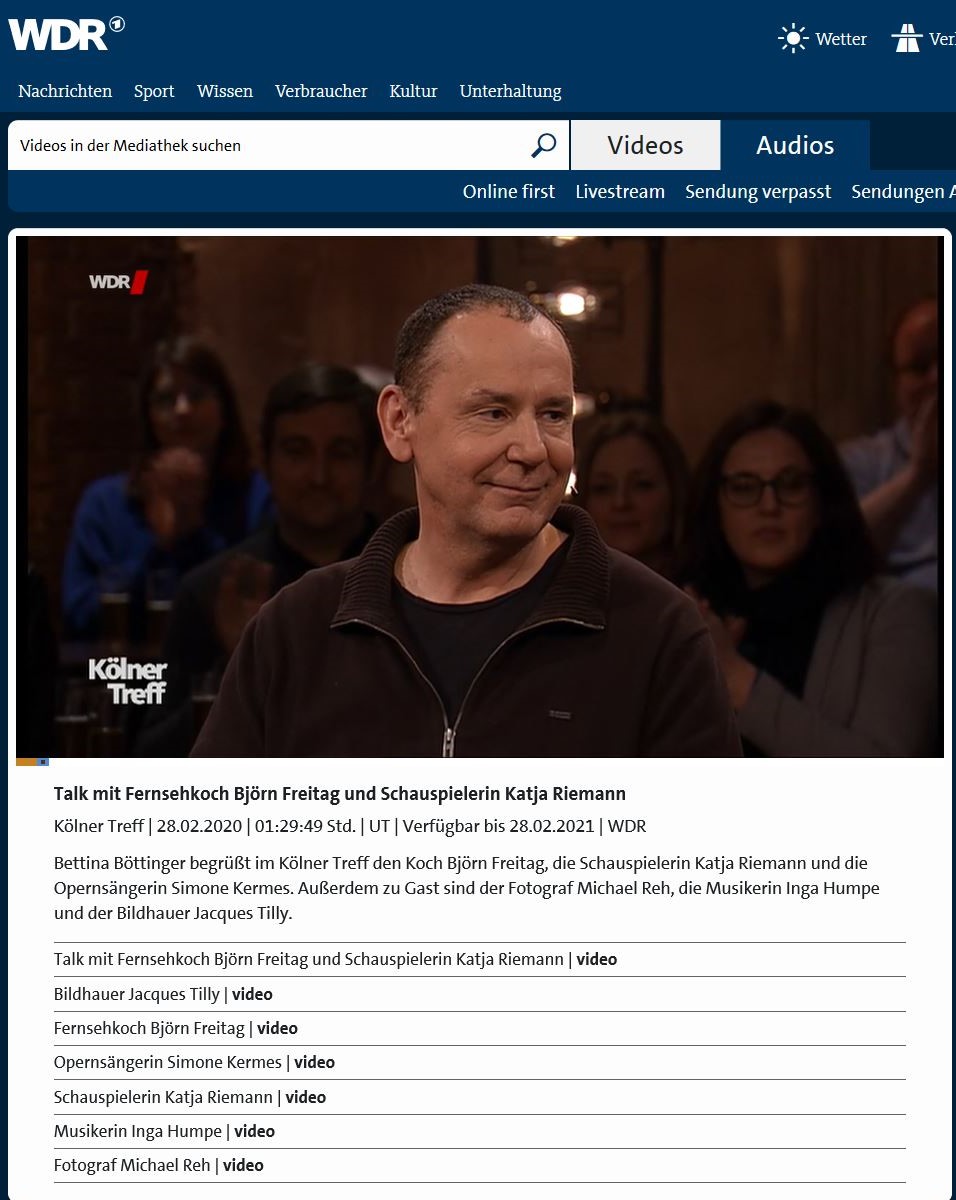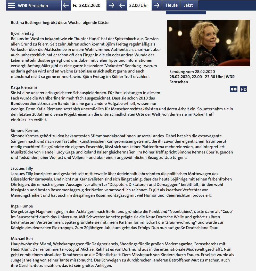 TV-Talk "Kölner Treff" am 28.2.2020, 22 Uhr im WDR. Gäste: Björn Freitag, Katja Riemann, Simone Kermes, Jacques Tilly, Inga Humpe, Michael Reh. Jacques Tillys Auftritt lag direkt am Anfang innerhalb der ersten 15 Minuten.