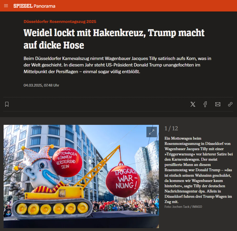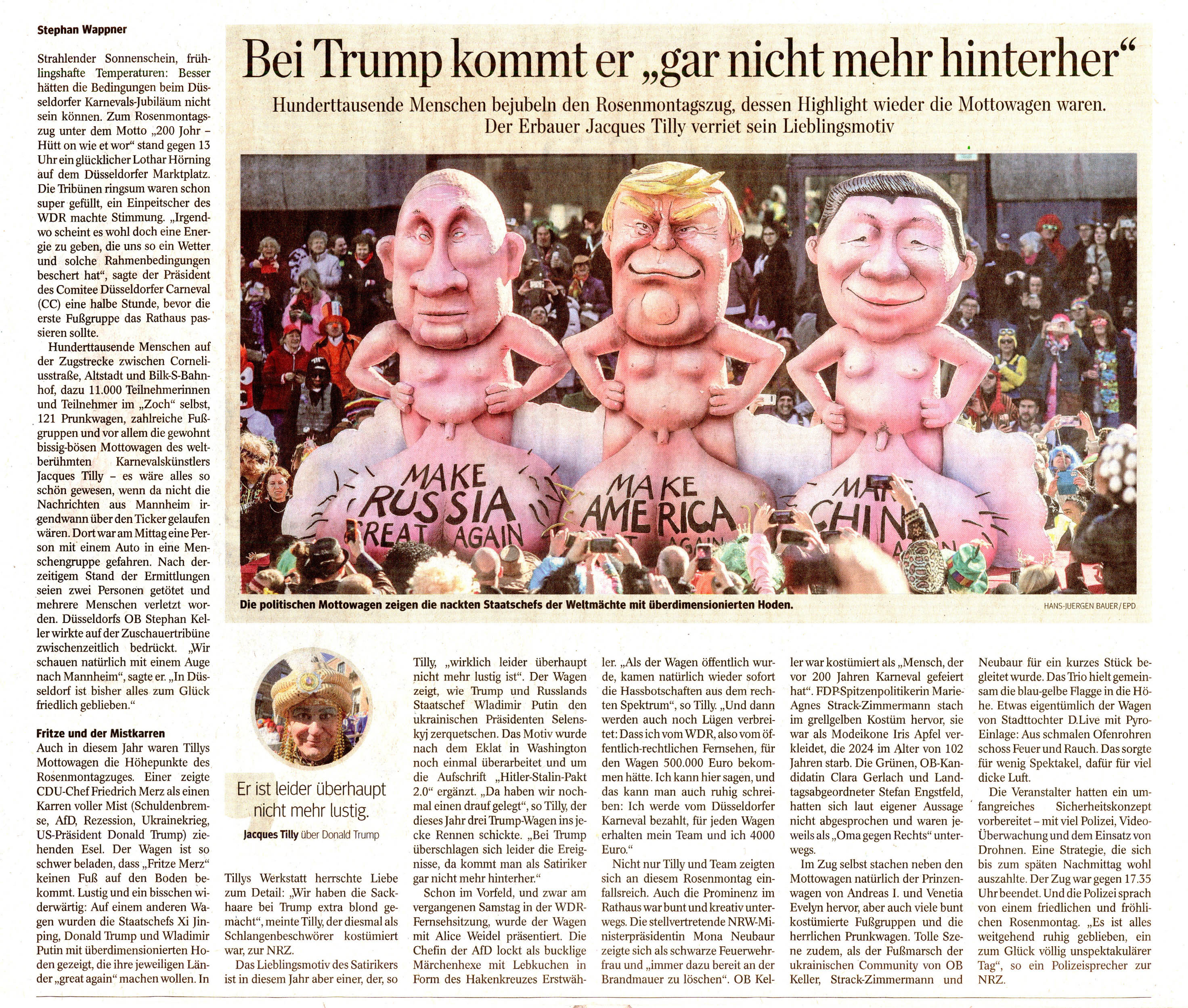 Rheinische Post, 18.3.2025, Reaktionen der Weltpresse auf die politischen Wagen des Düsseldorfer Rosenmontagszugs