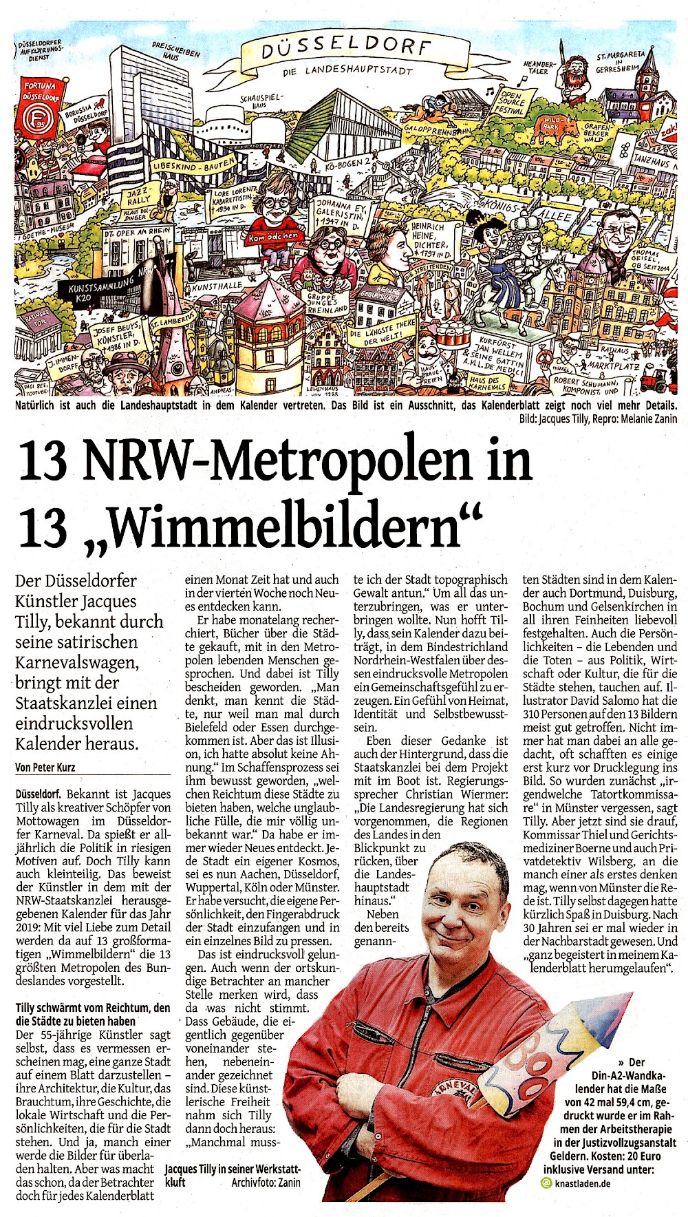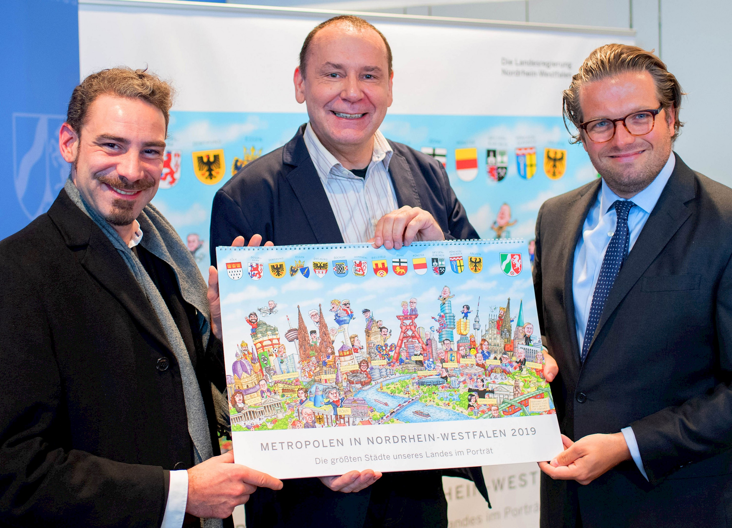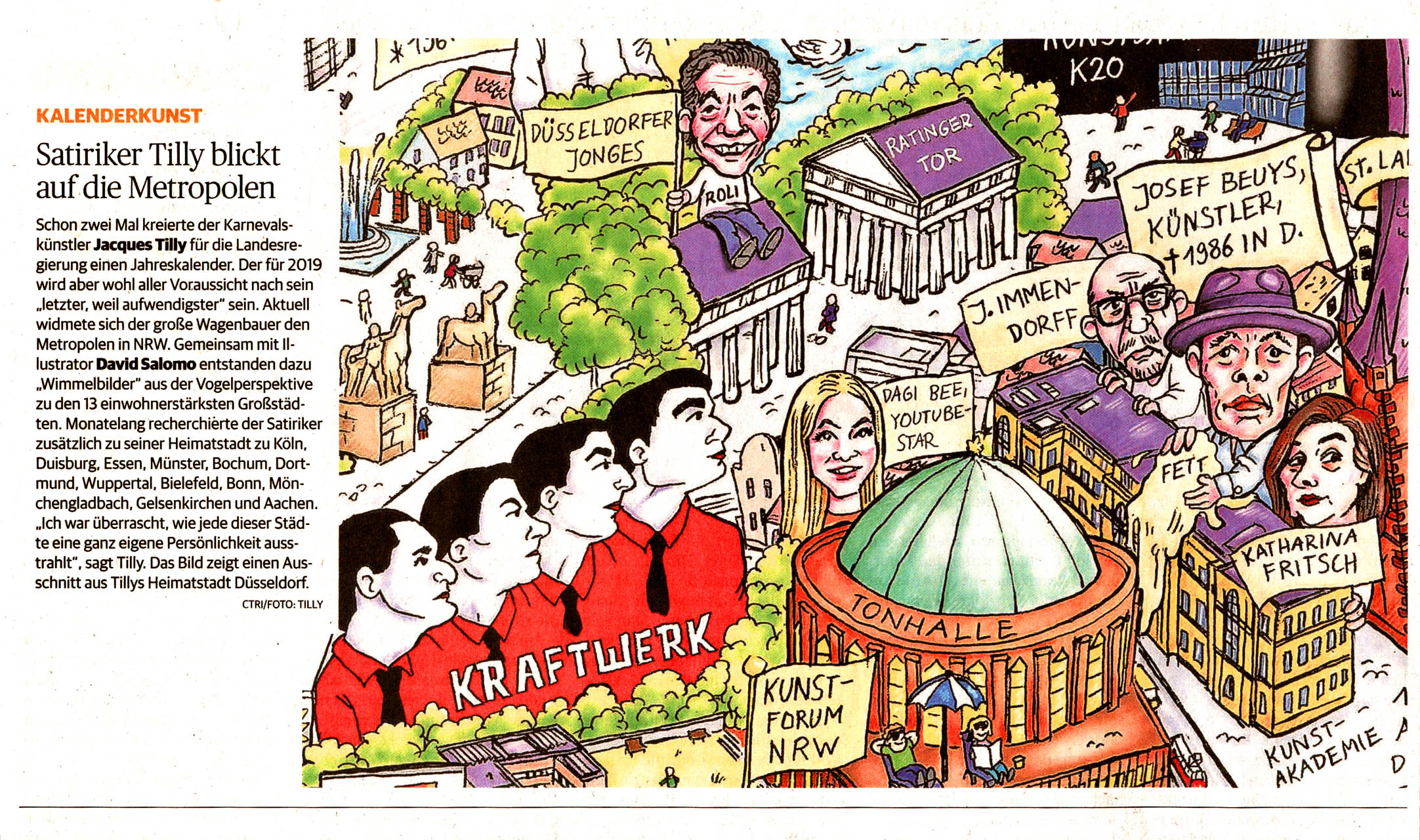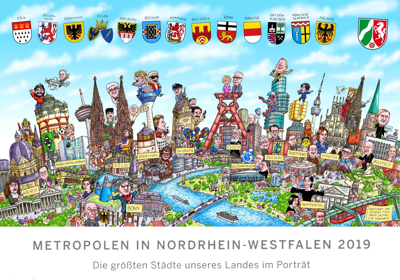 Von Köln bis Aachen hat das Jacques-Tilly-Team die 13 größten NRW-Städte (mit über 250.000 Einwohnern) im NRW-Kalender 2019 in großformatigen Wimmelbildern in all ihren Facetten (Architektur, Parks, Kultur, Geschichte, prägende Persönlichkeiten, Medien, Wirtschaft usw.) dargestellt.