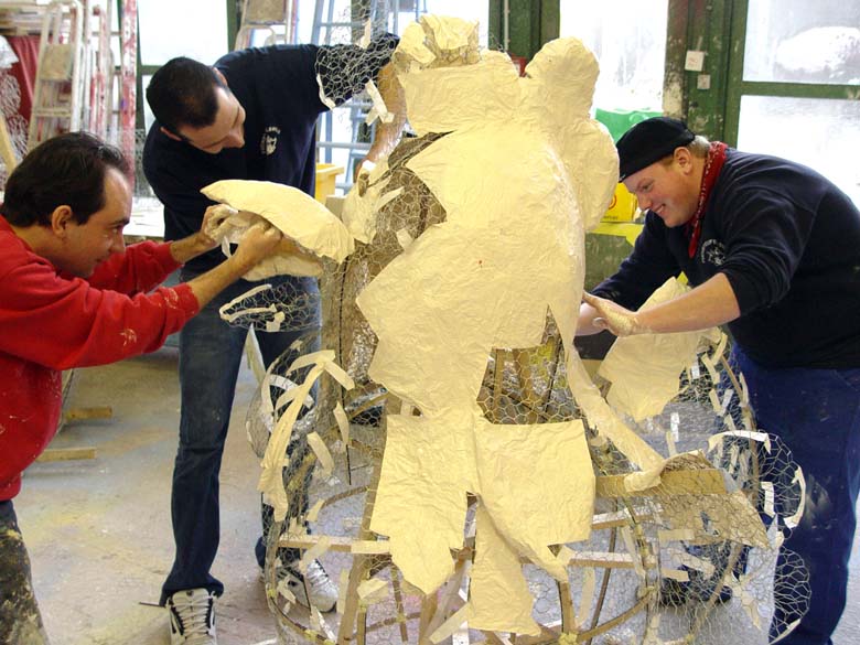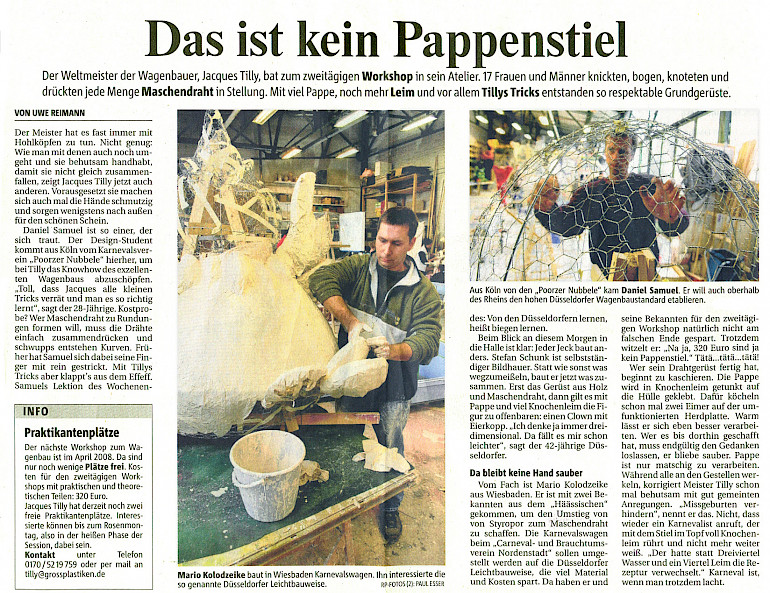 Der Düsseldorfer Karnevalswagenkünstler Jacques Tilly lehrt im "Workshop Figurenbau" die Kunst, Figuren und Karnevalswagen in der Düsseldorfer Leichtbautechnik zu bauen, also mit Maschendraht und einer Schicht Papierkaschur. Gezeigt wird der gesamte Bauprozess von A bis Z, vom Entwurf bis zum letzten Pinselstrich. Einen besonderen Schwerpunkt bildet die bildhauerische Arbeit mit dem verzinkten Maschendraht.